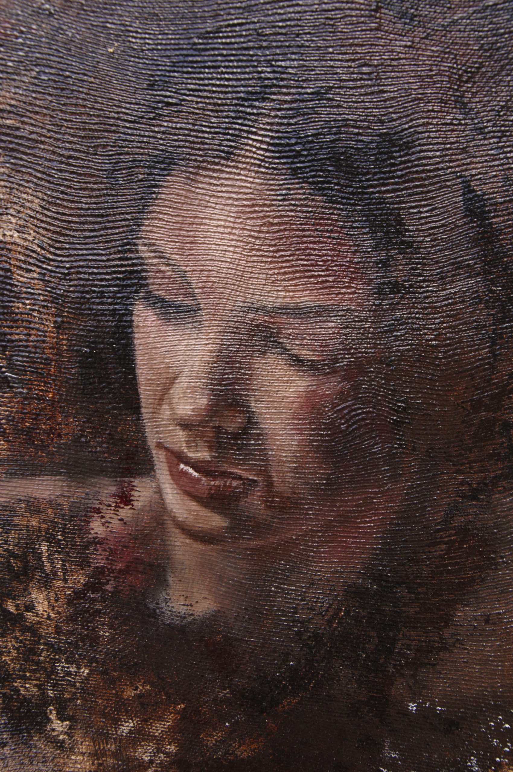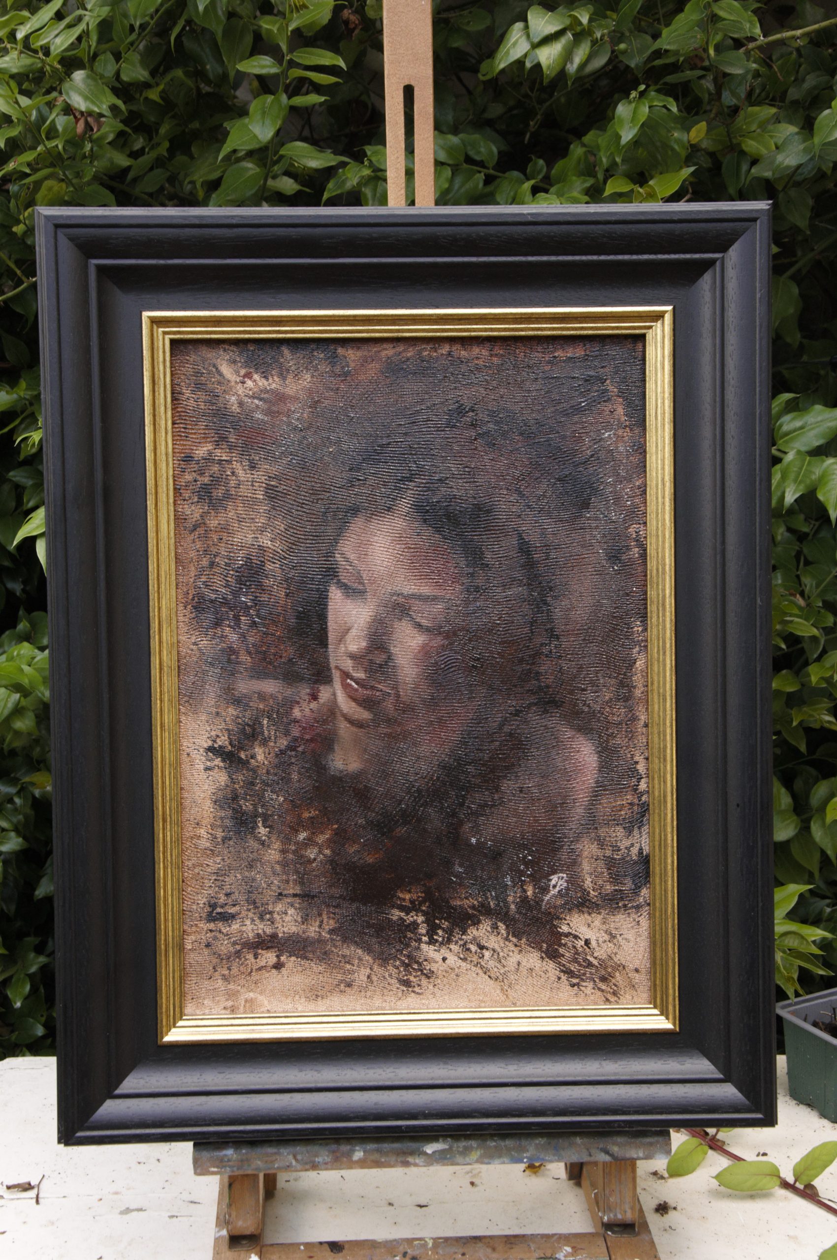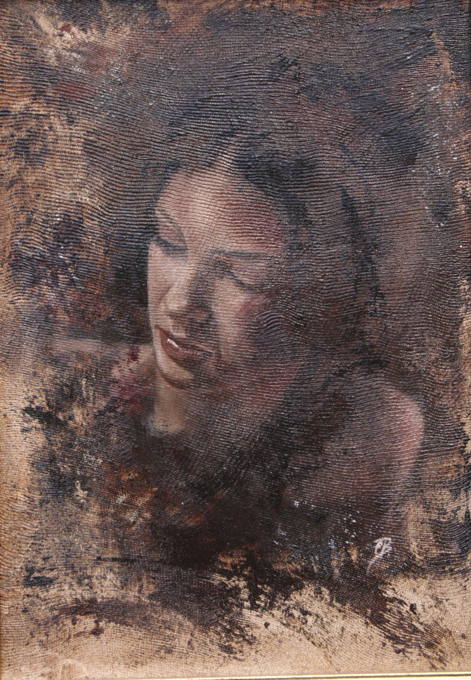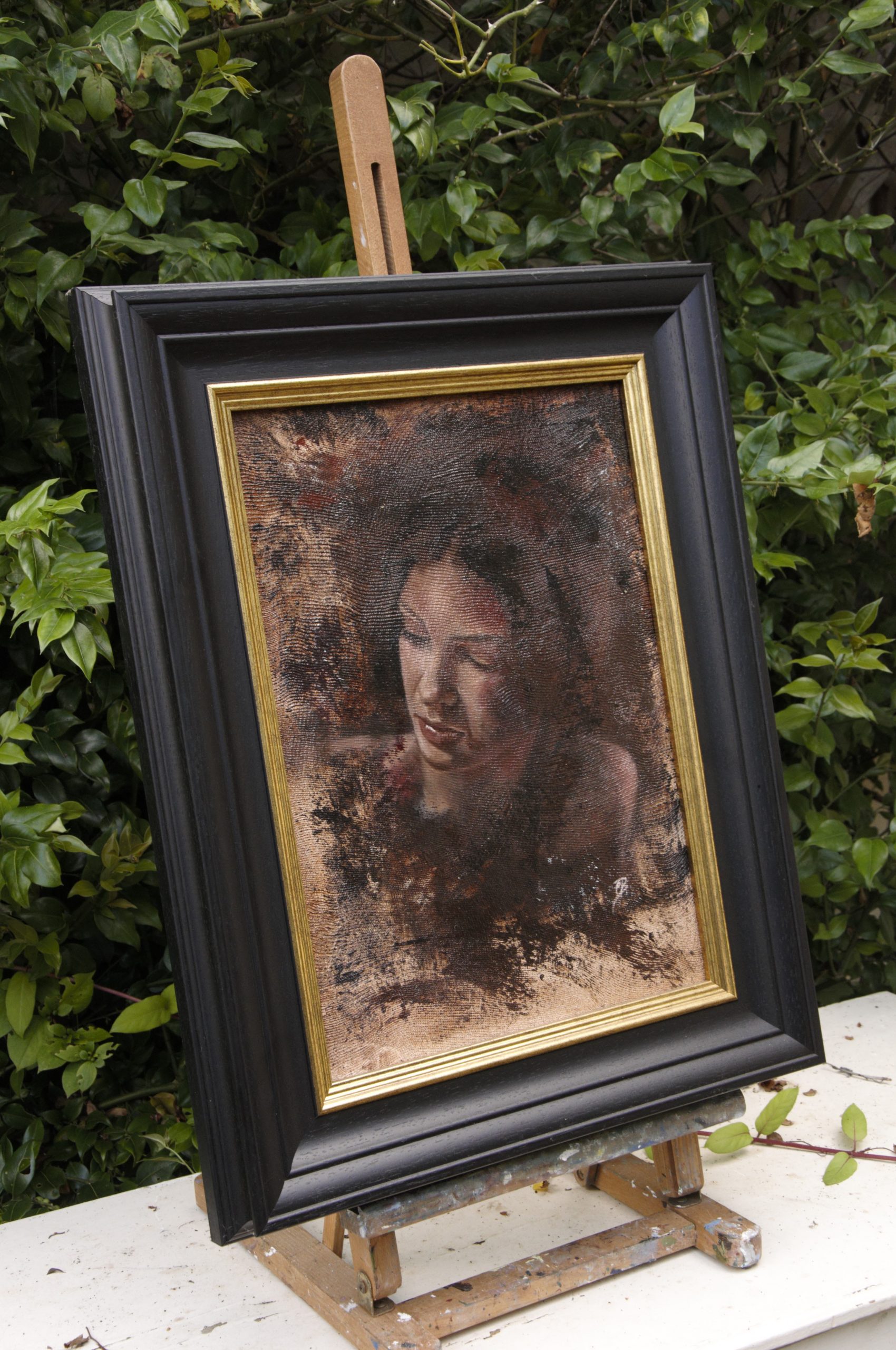 Oil on birch cradled wood panel, covered with muslin cloth for a textured finish. – 30cm x 42cm