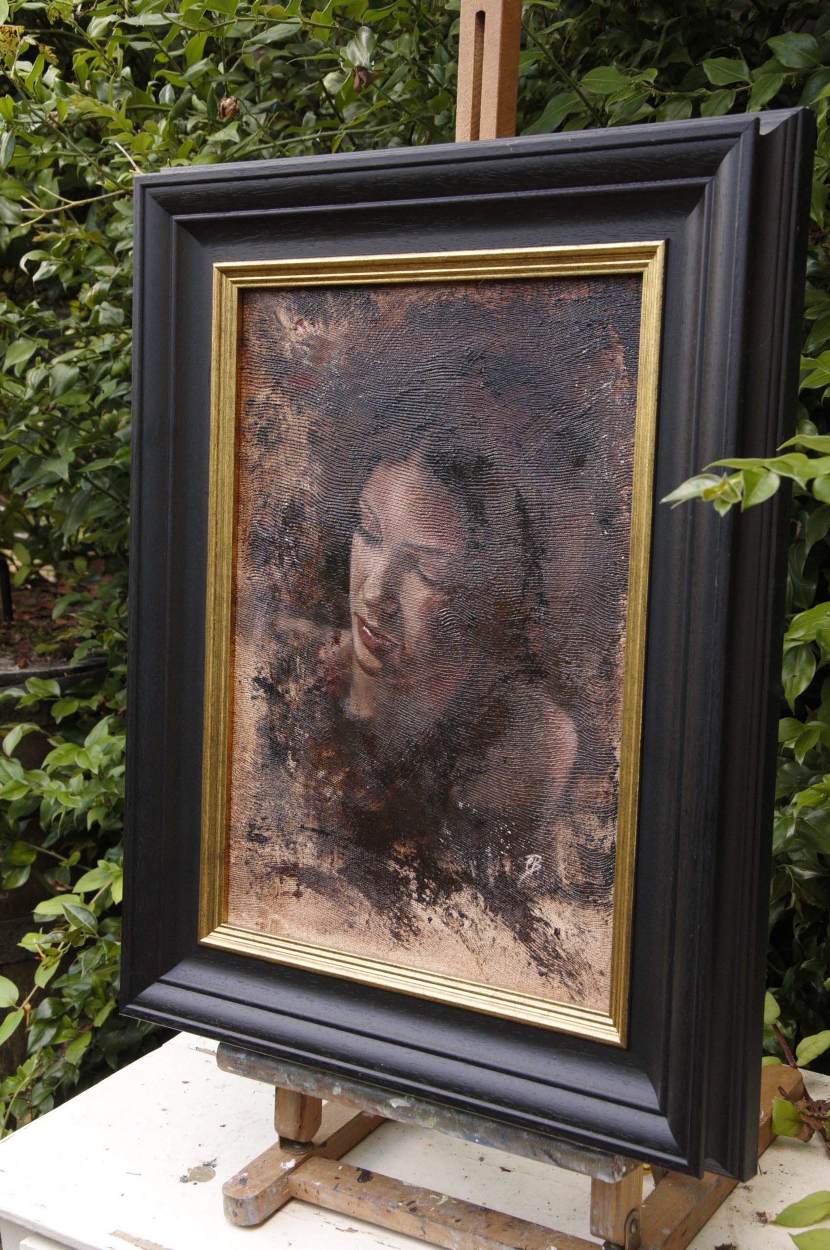 Framed in a simple chunky, solid wood frame. Soft black with a gold interior trim. External dimensions including frame – 44cm x 56.5cm.