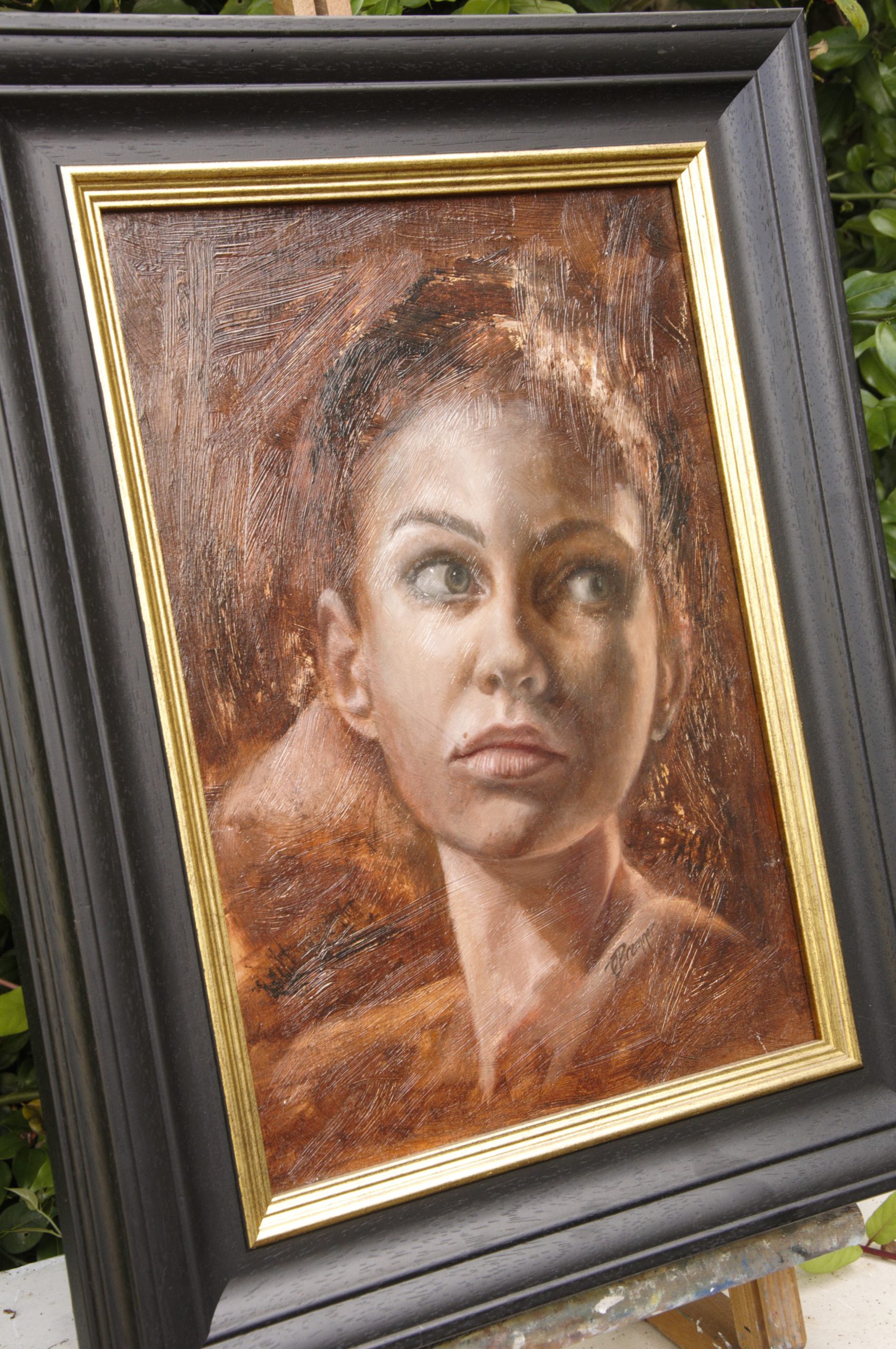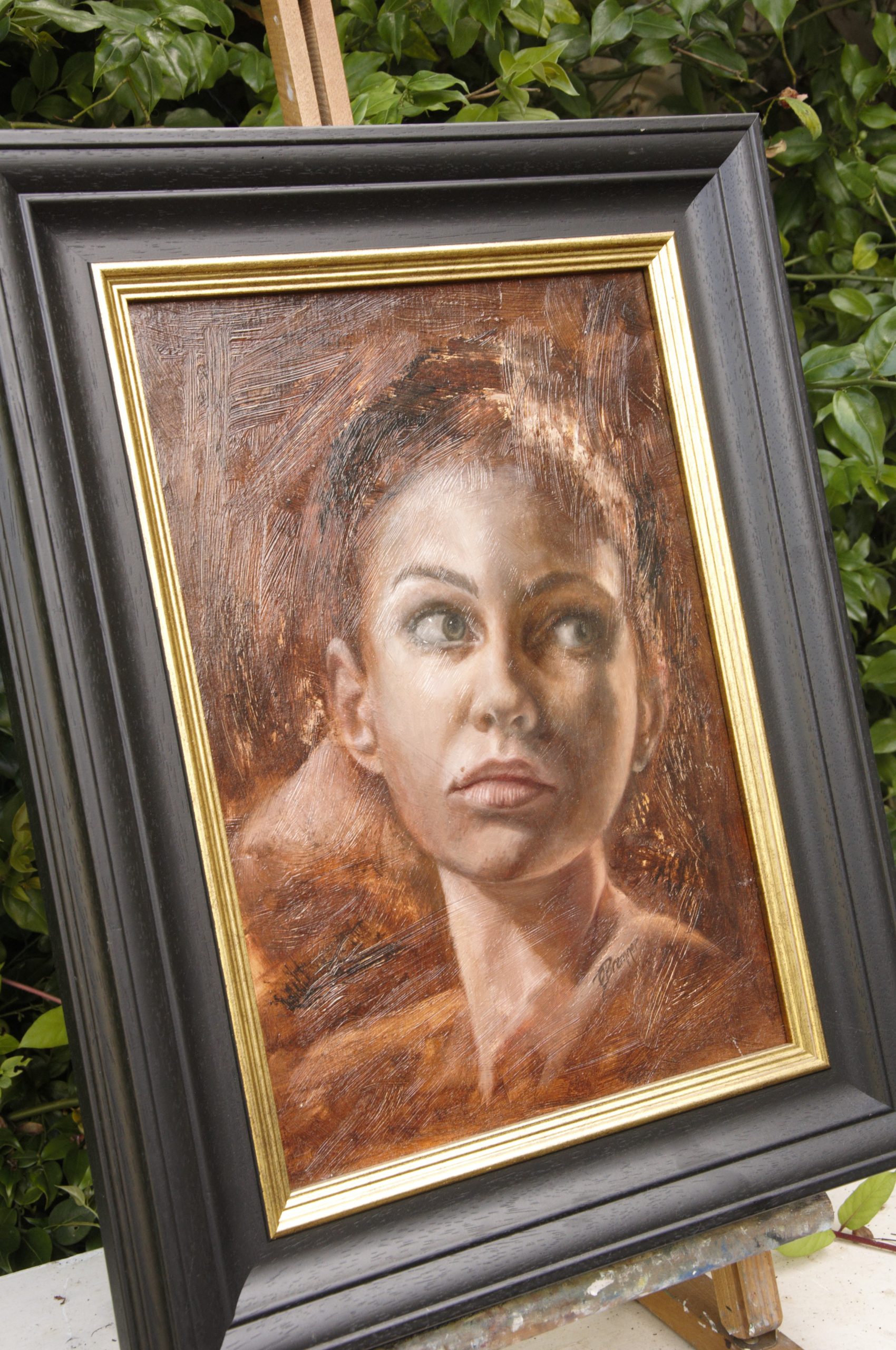 Framed in a simple chunky, solid wood frame. Soft black with a gold interior trim. External dimensions including frame – 44cm x 56.5cm.