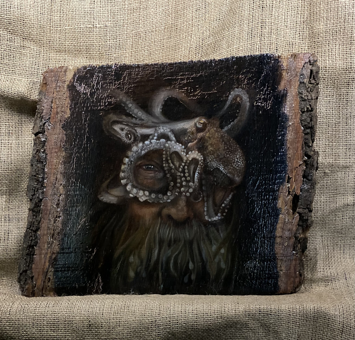 Oil on rough wood panel with bark – 40cm x 31cm approximately.